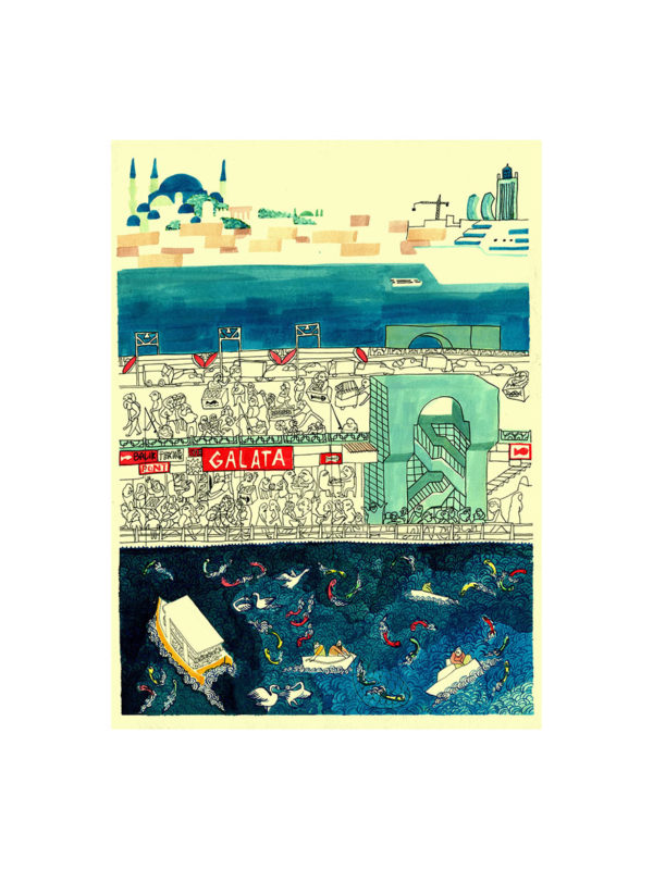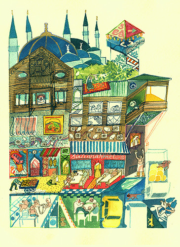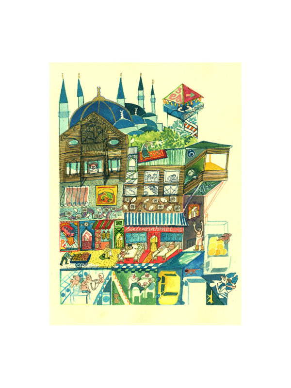 30 Birds est parti d’un livre qu’on a fait à Istanbul, on y avait découvert les miniatures persanes. Le Carnet d’Istanbul raconte une Istanbul moderne dont les quartiers sont condensés dans des illustrations composées à partir des miniatures persanes. Ces images, qui datent du 15e siècle, illustrent les contes perses. Laurent a créé un set-up numérique avec ces miniatures revisitées, ça a donné la base 2D/3D de notre jeu : tu tournes autour de volumes qui articulent des grandes peintures. Les miniatures pour moi c’est une mine d’inspiration graphique : les motifs, les couleurs et des espaces perspectifs très différents de ce que je connaissais. Pour le scénario, Laurent est allé chercher du côté des 1001 nuits.