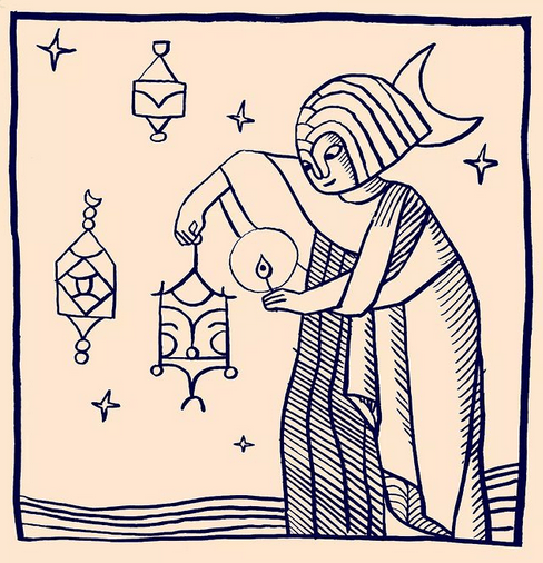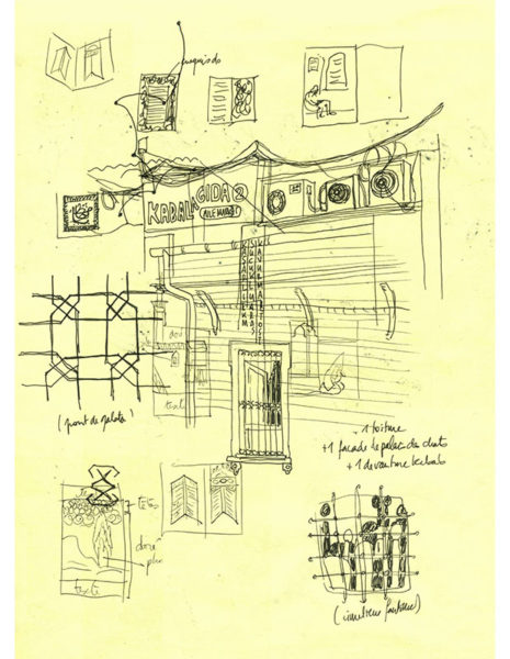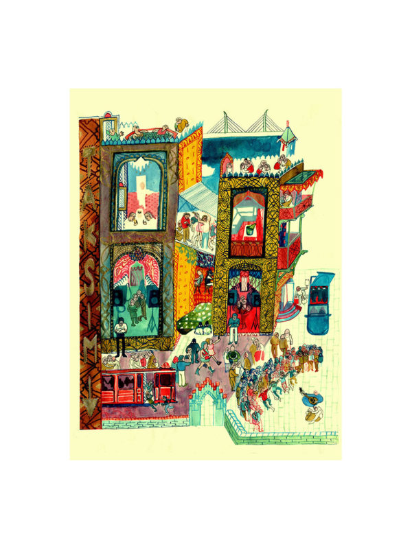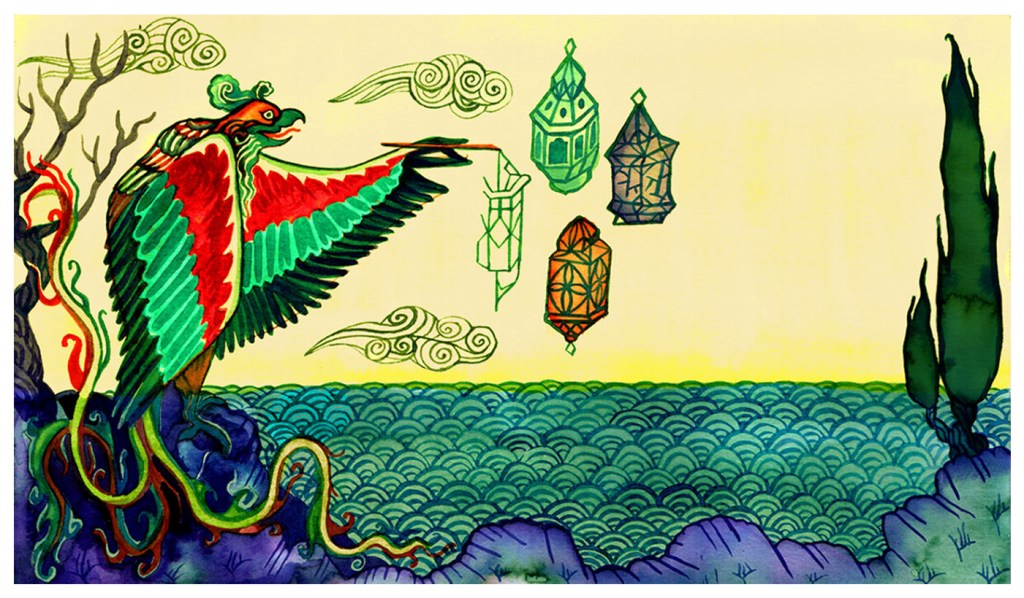Le fait est que les miniatures persanes sont des images qui illustraient les contes dans les LIVRES, donc ce sont des images VERTICALES. Et si on perdait ça, on perdait trop de la réf, donc on a décidé de garder les compositions verticales et de les disposer sur les faces de volumes qui sont devenues les lanternes-quartiers de 30 Birds.