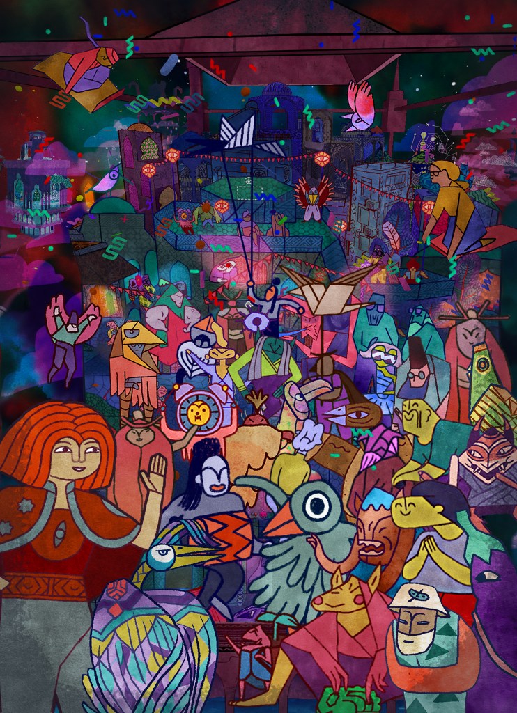Pour ce qui est de l’histoire, Laurent s’inspire de contes divers mais plus spécifiquement russes et persans, en particulier les Mille et Une Nuits. La quête principale du jeu et les 30 oiseaux sont directement inspirés du poème soufi La Conférence des oiseaux écrit par Attar de Nishapur au XIIème siècle. Le livre Mon nom est Rouge de l’écrivain turc Orhan Pamuk est aussi une grosse source d’inspiration en ce qui concerne l’art des miniatures persanes. L’aspect anachronique et réaliste magique tient pas mal du dessin animé Adventure Time. En terme de jeu vidéo, des jeux comme Paper Mario et Fez sont bien sûr des références graphiques pour le mélange de 2D et 3D. Côté mécaniques et ambiance, on peut citer les jeux d’Amanita Design, des jeux de manipulation comme Windosill et GNOG, et on retrouve le côté monde ouvert et rempli de petites histoires de Sludge Life, même si dans une tonalité totalement différente.